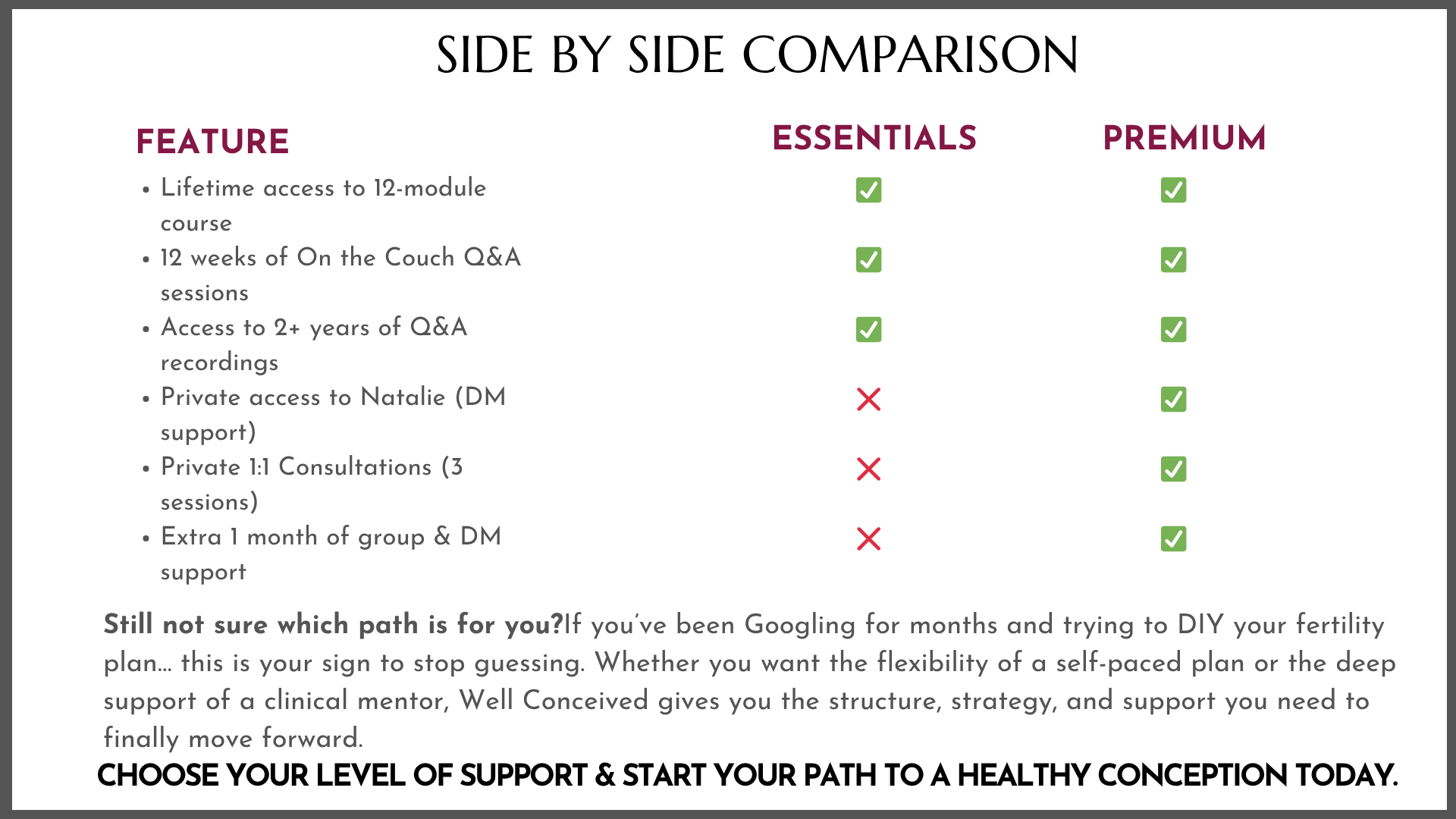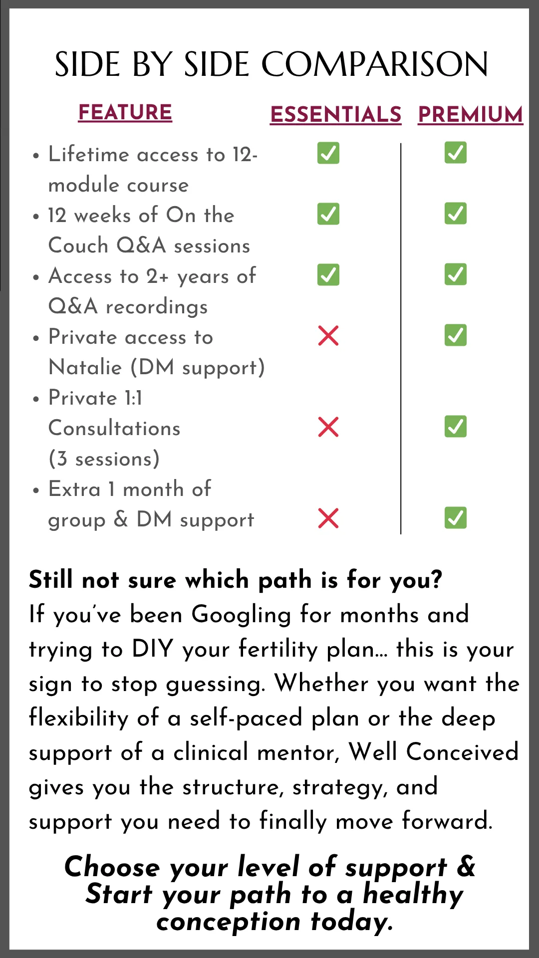 Included in the course is a 1:1 coaching session, together we will create a personalized plan with your Fertility Journey Update to customize your time inside Well Conceived. We also get together fortnightly for group style Q&A's. You'll also get access to me daily inside the private Well Conceived Community. This is a great space to ask questions about your cycle and your results. Get clarity about your next steps and get tips for easy diet and lifestyle changes. You'll also be inspired and motivated by the other fertility warriors in the course. Access to further private consultations may be available if required at an extra cost.
